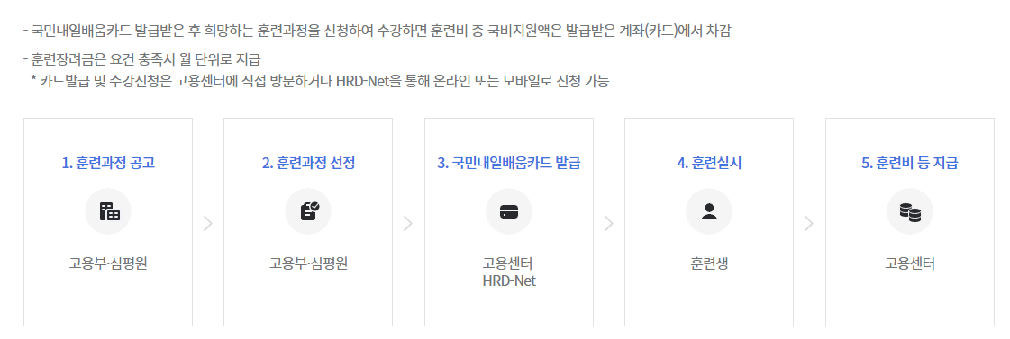 내일배움카드는 국민일자리 민원서비스의 일환으로 제공되는 혜택 중 하나입니다. 이 카드를 통해 국비지원 직업훈련을