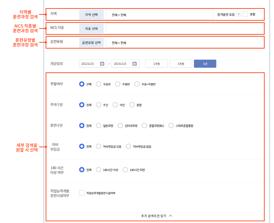 지역, 직업, 훈련 유형 등의 카테고리를 선택하여 검색할 수 있으며, 직접 입력하여 원하는 지역을 검색할 수도 있습니다.