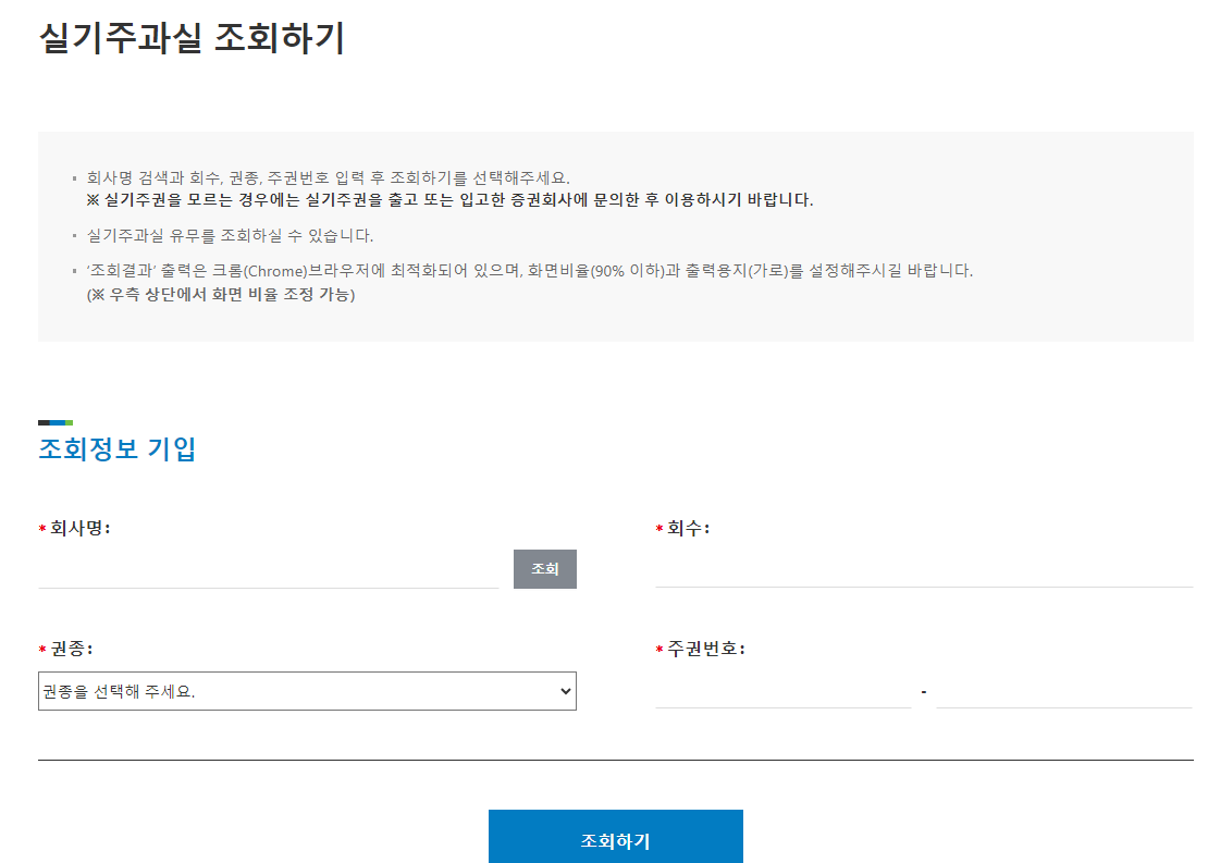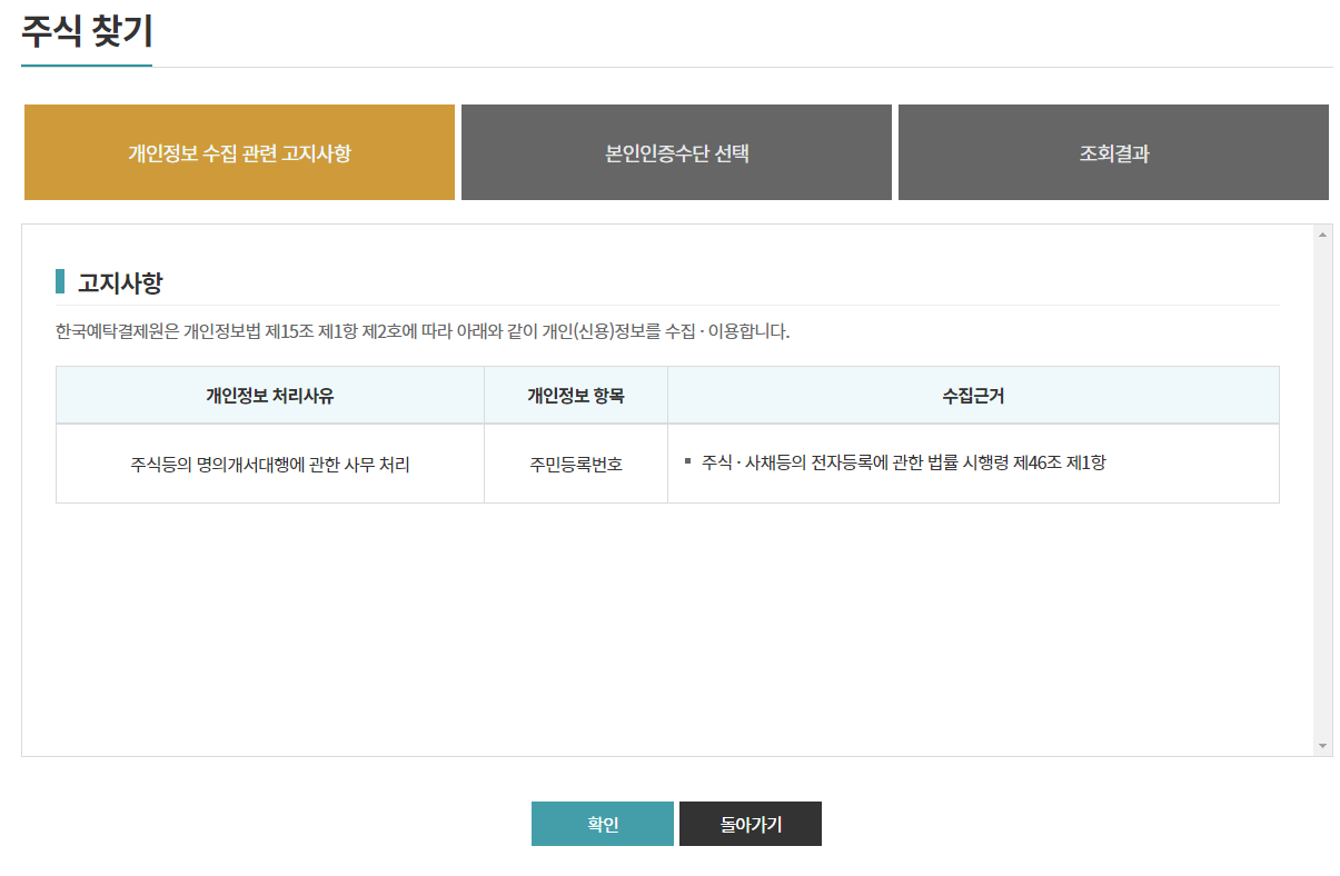 주식 찾기 - 증권회사를 이용하지 않는 주주의 미수령 주식 또는 종이주권의 보유내역을 조회할 수 있습니다.